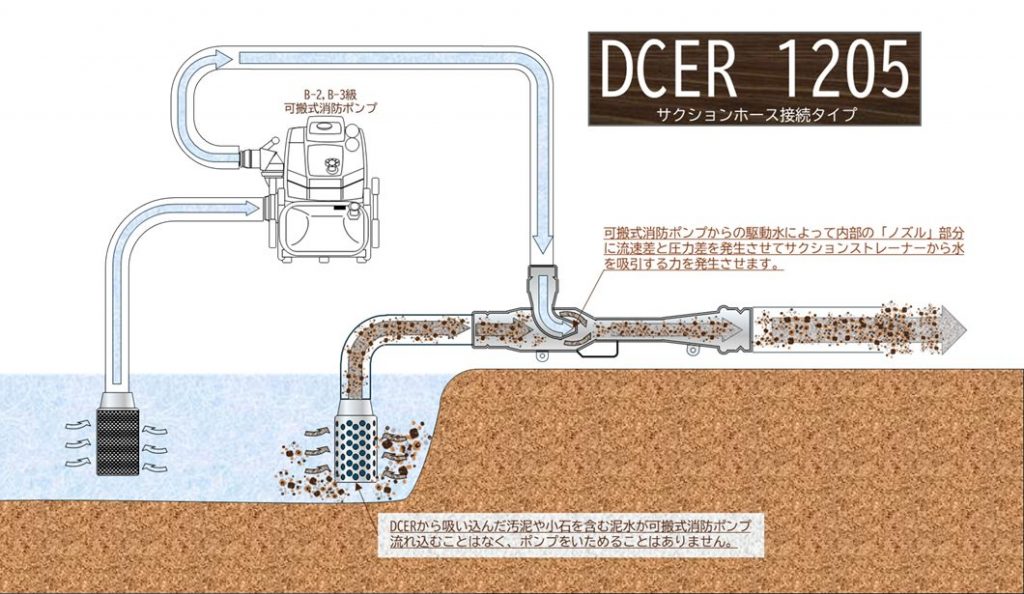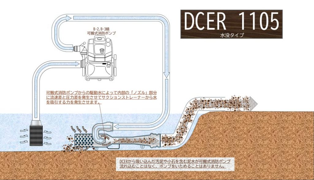 B-2級・B-3級ポンプとの併用で、約2台分の排水量を実現。スピーディーな排水処理が可能『ダブル・キャパシティ・ウォータ・ジェット・エダクター(DCER)』は、駆動水の運動エネルギーを利用して、吸水口から水を取り込み、B-2級・B-3級ポンプを使用した際の排水量を約2倍に高められる製品です。